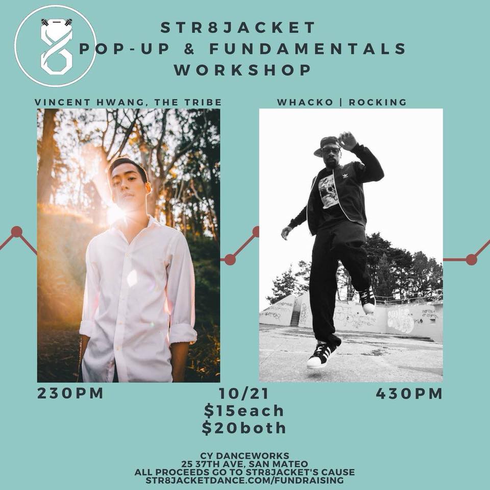Vincent Hwang and Whacko Fundraising workshops Saturday, October 21, 2017 2:30 PM 6:00 PM Str8jacket Dance Company 25 37th Avenue San Mateo, CA, 94403 United States (map) Google Calendar ICS Come join Str8jacket for a day of fun filled workshops featuring Vincent Hwang from The Tribe and Whacko from the freestyle community. A great opportunity to collide different styles and create a community between the freestylers and choreographers. All proceeds will go to Str8jacket's cause! $15 each | $20 both