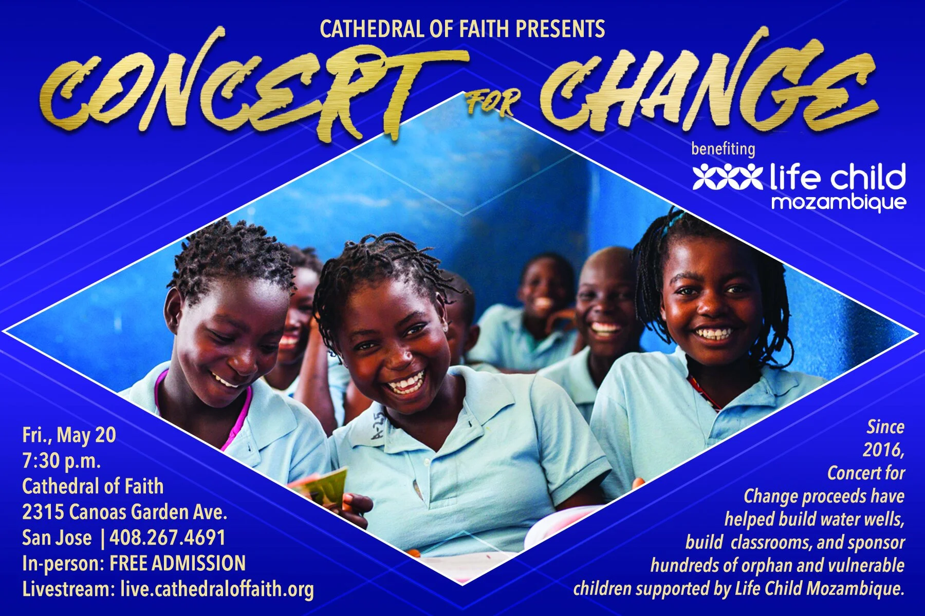 On Friday, May 20th at 7:30 p.m., the Bay Areaโs best dance crews and worship leaders will take the stage at Concert for Change. This FREE concert benefits Life Child which supports orphan and vulnerable children in Mozambique. Featuring performances by COFY, Commonality, Francis & Erika Tyrell, Jessica Johnson, Krazy8, Str8jacket, Third Culture Worship and more! Everyone is welcome, so please spread the word, and join us in person at Cathedral of Faith or tune in online at live.cathedraloffaith.org.